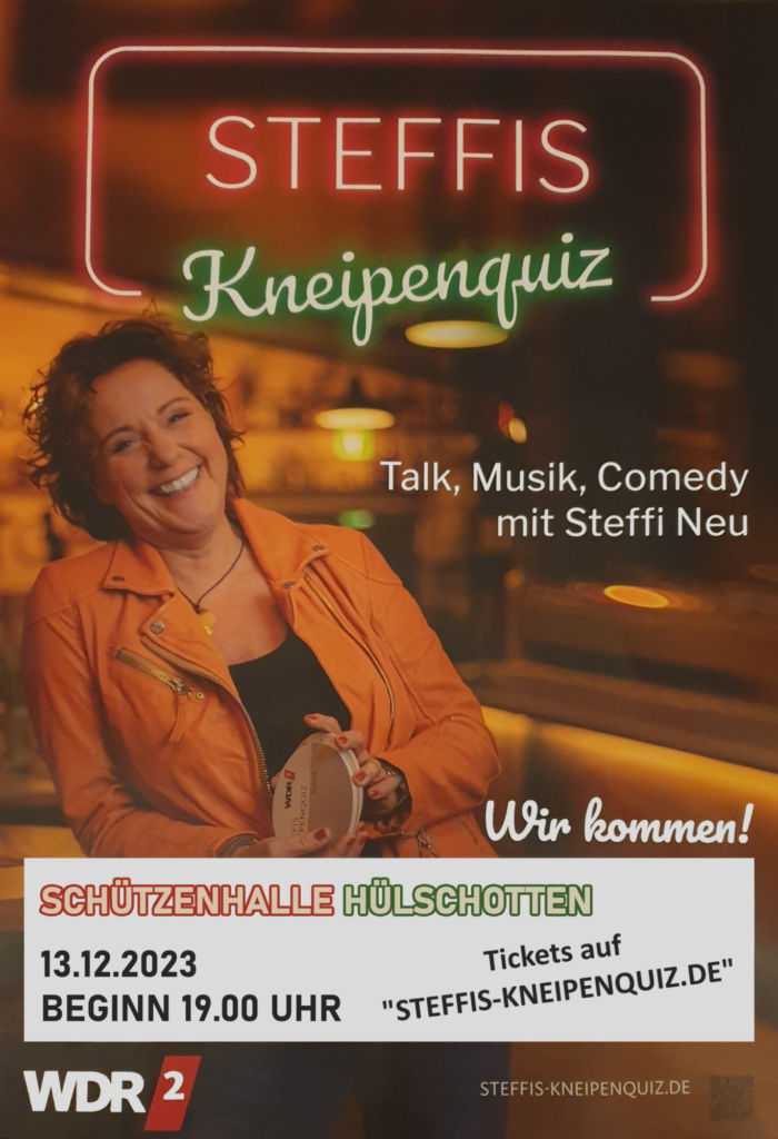auch wenn Steffis Kneipenquiz noch etwas hin ist: Die Karten sind nicht unendlich und werden am 12.03.2023 zwischen 10.00 Uhr – 12.00 Uhr im Speiseraum verkauft! Die bisherigen Reservierungen werden natürlich berücksichtigt, halten aber nur bis 11.00 Uhr. Danach gehen die Karten in denn allgemeinen Verkauf.