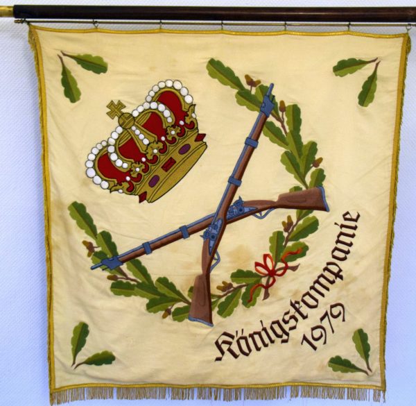 Die Königsfahne zeigt auf der einen Seite sich kreuzende Gewehre, die von einer Kaiserkrone gekrönt werden. Hinter den Gewehren befindet sich ein Eichenblattkranz mit Eicheln, der in der Mitte unterhalb der Gewehre durch eine rote Schleife geziert wird. In den Ecken der beigen Fahne befindet sich je zwei einzelne Eichenblätter. Unter der roten Schleife befindet sich der Schriftzug „Königskompanie 1979“.