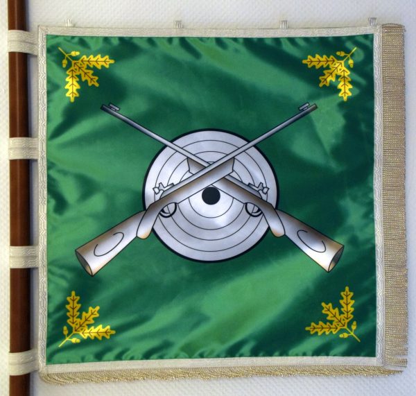 Die Kinderfahne zeigt auf der einen Seite sich kreuzende Gewehre mit einer dahinter liegenden Zielscheibe, das ganze auf einem grünen Grund. Die Ecken der Fahne werden von goldenen drei-blättrigen Eichelzweige mit je zwei Eicheln geziert.