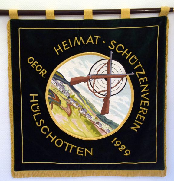 Die Vereinsfahne zeigt auf der einen Seite in einem goldenen Kreis auf samtgrünen Grund das Dorf Hülschotten. Über dem Dorf befinden sich im Himmel zwei sich kreuzende Gewehre mit einer dahinterliegenden Zielscheibe. Der Goldene Kreis wird umringt von dem Schriftzug „Heimat-Schützenverein Hülschotten“ und auf höhe des Dorfes horizontal umrandet von dem Schriftzug „Gegr. 1929“.