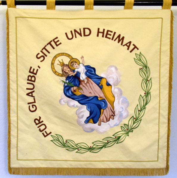 Die andere Seite zeigt mit einem halben Ilex-Kranz umrundete, auf Wolken stehende Maria mit dem Jesuskind auf beigen Grund. Die andere Seite der Maria wird von dem Schriftzug „Für Glaube, Sitte und Heimat“ umrundet und bildet mit dem Ilex einen geschlossenen Kreis um Maria.